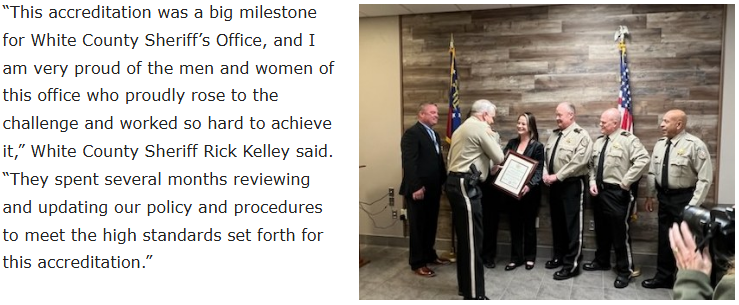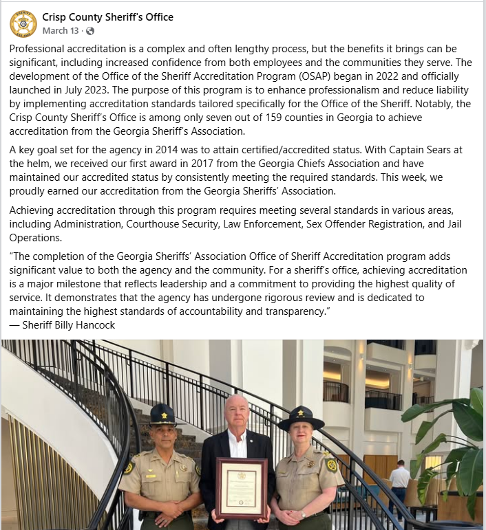 The Georgia Sheriffs’ Association, Office of Sheriff Accreditation Program is a process to determine if defined standards are met. An accreditation program is a means to acknowledge that the highest standards of professionalism in areas specific to the Office of Sheriff have been achieved.